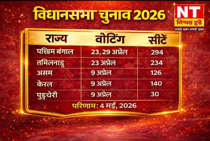 मुख्य चुनाव आयुक्त ज्ञानेश कुमार ने आज शाम 4 बजे नई दिल्ली स्थित विज्ञान भवन में प्रेस कॉन्फ्रेंस कर तारीखों का एलान किया। इस साल 2026 में पांच राज्यों पश्चिम बंगाल, असम, केरल, तमिलनाडु और पुडुचेरी में चुनाव होने हैं।