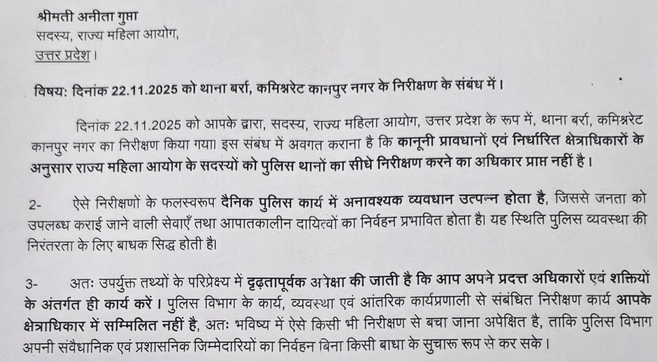 कानपुर पुलिस ने राज्य महिला आयोग की सदस्य अनीता गुप्ता को नोटिस भेजकर “हद में रहने” की चेतावनी दी है।22 नवंबर को उन्होंने थाना बर्रा का निरीक्षण किया था, जिसके बाद पुलिस ने कहा—