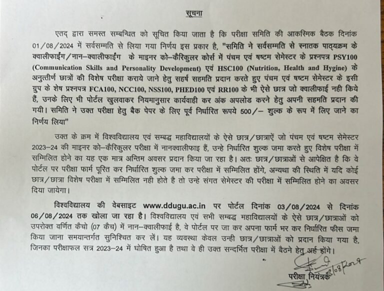 एतद् द्वारा समस्त सम्बन्धित को सूचित किया जाता है कि परीक्षा समिति की आकस्मिक बैठक दिनांक 01/08/2024 में सर्वसम्मति से लिया गया निर्णय इस प्रकार है, “समिति ने सर्वसम्मति से स्नातक पाठ्यक्रम के क्वालीफाईंग/नान-क्वालीफाईंग के माइनर को कैरिकुलर कोर्स में पंचम एवं षष्टम सेमेस्टर के प्रश्नपत्र PSY100 (Communication Skills and Personality Development) एवं HSC100 (Nutrition, Health and Hygine) के अनुत्तीर्ण छात्रों की विशेष परीक्षा कराये जाने हेतु सहर्ष सहमति प्रदान करते हुए पंचम एवं षष्टम सेमेस्टर के इसी ग्रुप के शेष प्रश्नपत्र FCA100, NCC100, NSS100, PHED100 एवं RR100 के भी ऐसे छात्र जो क्वालीफाई नही किये हैं, उनके लिए भी पोर्टल खुलवाकर नियमानुसार कार्यवाही कर अंक अपलोड करने हेतु अपनी सहमति प्रदान की गयी। समिति ने उक्त परीक्षा हेतु बैक पेपर के लिए पूर्व निर्धारित रूपये 500/- शुल्क के रूप में लिए जाने का निर्णय लिया”.