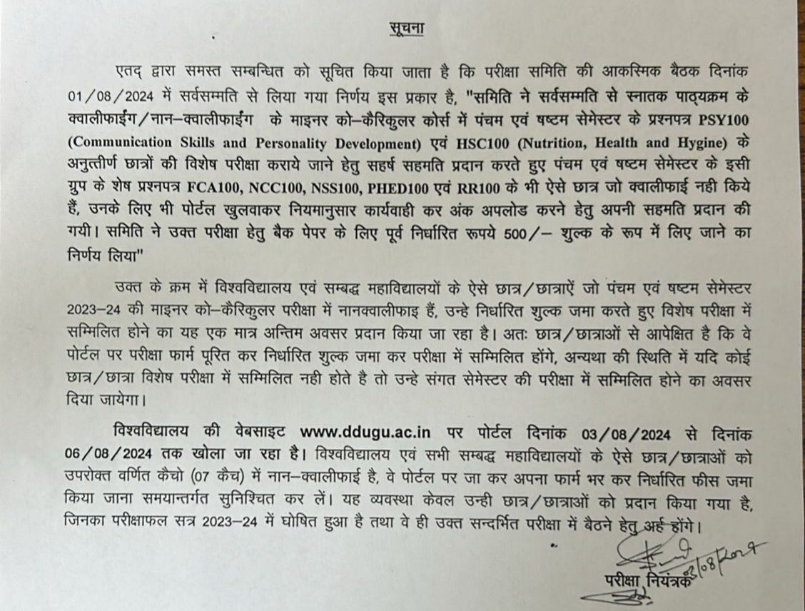 विश्वविद्यालय की वेबसाइट www.ddugu.ac.in पर पोर्टल दिनांक 03/08/2024 से दिनांक 06/08/2024 तक खोला जा रहा है। विश्वविद्यालय एवं सभी सम्बद्ध महाविद्यालयों के ऐसे छात्र/छात्राओं को उपरोक्त वर्णित कैचो (07 कैच) में नान-क्वालीफाई है, वे पोर्टल पर जा कर अपना फार्म भर कर निर्धारित फीस जमा किया जाना समयान्तर्गत सुनिश्चित कर लें। यह व्यवस्था केवल उन्ही छात्र/छात्राओं को प्रदान किया गया है, जिनका परीक्षाफल सत्र 2023-24 में घोषित हुआ है तथा वे ही उक्त सन्दर्भित परीक्षा में बैठने हेतु अर्ह होंगे।