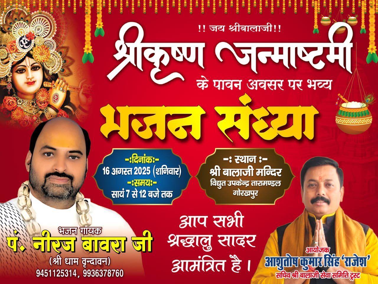 गोरखपुर। श्रीकृष्ण जन्माष्टमी के पावन अवसर पर श्री बालाजी मंदिर, विद्युत उपकेंद्र, तारामंडल, गोरखपुर में 16 अगस्त 2025, शनिवार को सायं 7 बजे से रात्रि 12 बजे तक भव्य भजन संध्या एवं अखंड कीर्तन का आयोजन किया जा रहा है। इस शुभ अवसर पर श्रीधाम वृंदावन से पधार रहे सुप्रसिद्ध भजन गायक पंडित नीरज बावरा जी अपनी मधुर वाणी से भक्ति, आनंद और श्रद्धा की अमृतधारा प्रवाहित करेंगे।