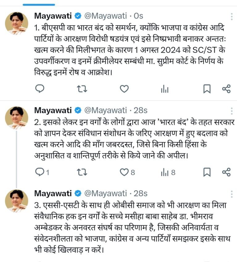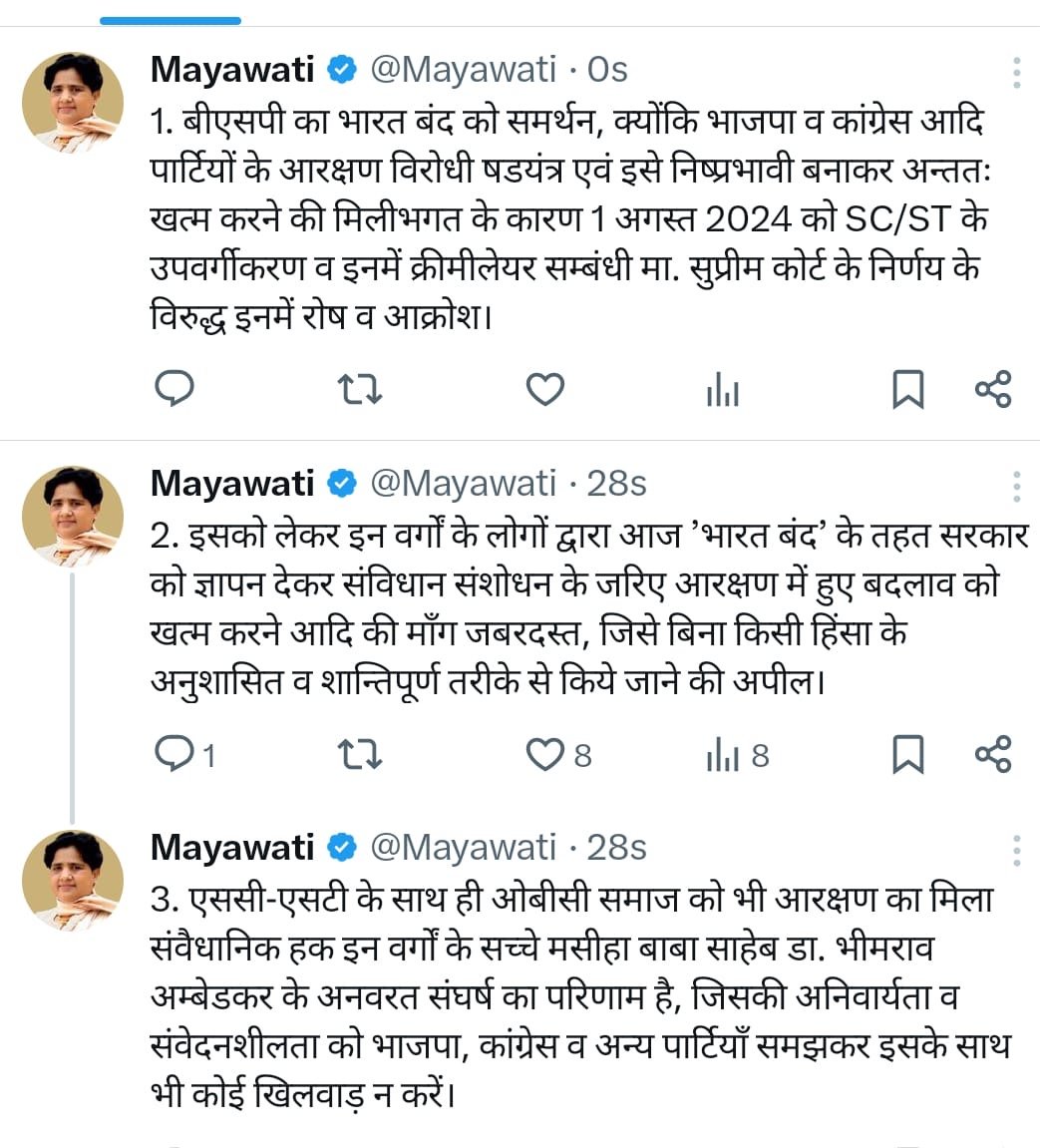 भारत बंद को बीएसपी सुप्रीमो मायावती ने समर्थन दिया है। उन्होंने कहा की शांति पूर्ण तरीके से आंदोलन किया जाए।