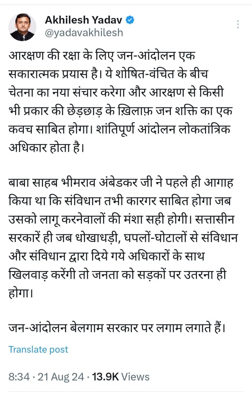 आरक्षण की रक्षा के लिए जन-आंदोलन एक सकारात्मक प्रयास है। ये शोषित-वंचित के बीच चेतना का नया संचार करेगा और आरक्षण से किसी भी प्रकार की छेड़छाड़ के ख़िलाफ़ जन शक्ति का एक कवच साबित होगा। शांतिपूर्ण आंदोलन लोकतांत्रिक अधिकार होता है।