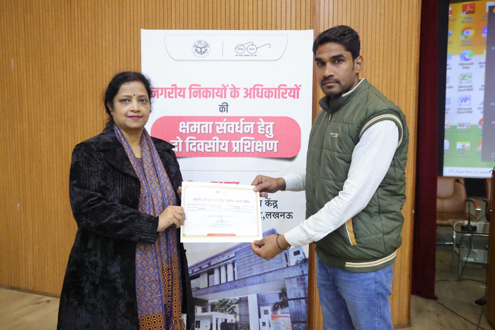 प्रशिक्षण में सफल प्रतिभागी नियाज़ अहमद को सहायक निदेशक, नगरीय प्रशिक्षण एवं शोध संस्थान लखनऊ, श्रीमती सविता शुक्ला द्वारा टैक्स कलेक्टर का प्रमाण-पत्र प्रदान किया गया।