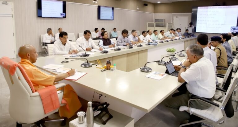 मुख्यमंत्री योगी आदित्यनाथ, अपने सरकारी आवास पर ऊर्जा विभाग की बैठक करते हुए