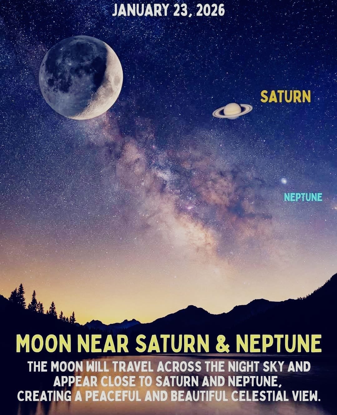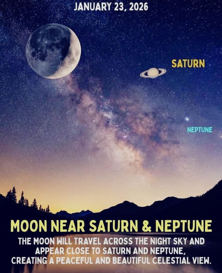 खगोलविद अमर पाल सिंह ने बताया कि 23 जनवरी की रात्रि के आकाश की ओर देखने पर आपको एक शानदार खगोलीय नज़ारा दिखाई देगा। उस दिन मीन (Pisces) तारामंडल में चंद्रमा और शनि ग्रह एक-दूसरे के बहुत क़रीब दिखाई देंगे, जिनके बीच की दूरी लगभग 4°21′ (डिग्री-मिनट) होगी।
