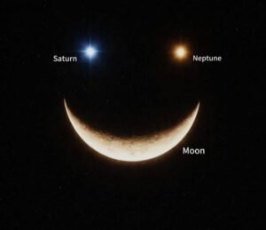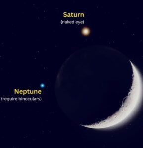 खगोलविद अमर पाल सिंह ने बताया कि इस खगोलीय घटना का आकाशीय विवरण निम्न प्रकार घटित होगा उस समय चंद्रमा 5 दिन का बढ़ता हुआ अर्धचंद्र (Waxing Crescent) होगा जो लगभग 26% प्रकाशित दिखाई देगा और उसी दौरान शनि ग्रह भी काफ़ी चमकीला होगा, जिसको साधारण आँखों से आसानी से देख सकते हैं साथ ही खगोलविद अमर पाल सिंह ने जानकारी देते हुए बताया कि नेपच्यून ग्रह हमारे सौर मण्डल का सूर्य से दूरी के क्रम में आठवां ग्रह है, जो कि सबसे बाह्य ग्रह है एवं इसका मैग्नीट्यूड लगभग +7.8 होता है इस कारण से यह साधारण आंखों से दिखाई नहीं देता है और यह किसी भी छोटी दूरबीन से भी बहुत धुंधला ग्रह दिखाई देता है, इसलिए इसे देखने के लिए किसी अच्छी दूरबीन या टेलीस्कोप की आवश्यकता पड़ती है।
