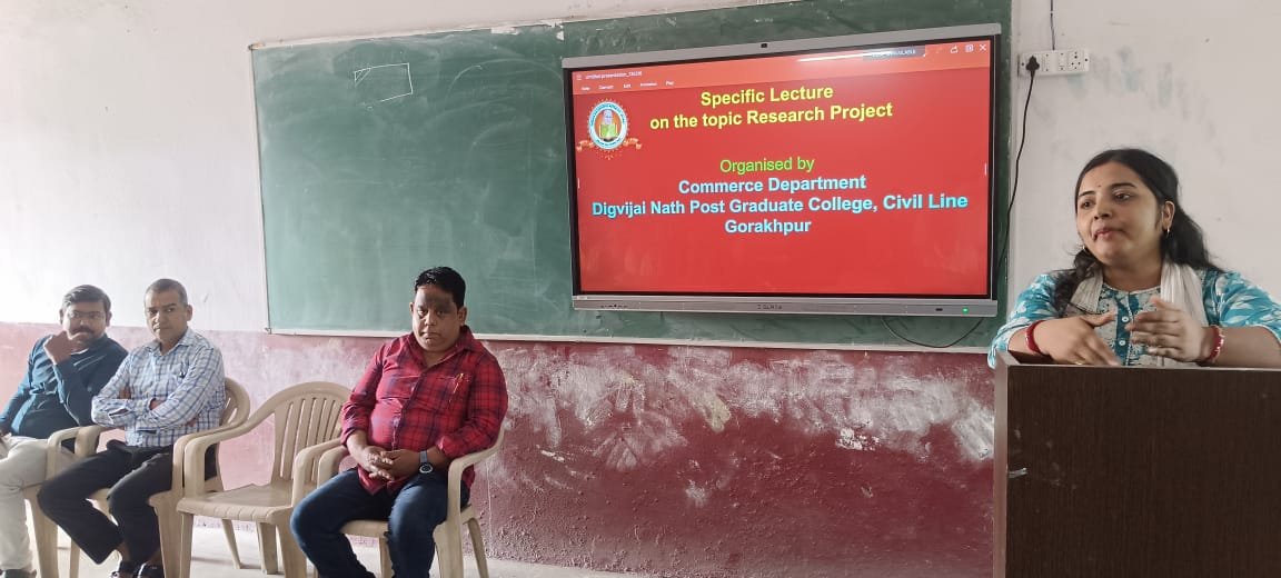 गोरखपुर। दिग्विजयनाथ स्नातकोत्तर महाविद्यालय के वाणिज्य विभाग में सोमवार को “रिसर्च प्रोजेक्ट एवं शैक्षणिक अनुसंधान पद्धति” विषय पर विशेष व्याख्यान का आयोजन किया गया। कार्यक्रम का उद्देश्य विद्यार्थियों में शोध के प्रति रुचि जागृत करना, अनुसंधान की प्रक्रिया को सरलता से समझाना तथा उच्च शिक्षा में रिसर्च आधारित अधिगम को प्रोत्साहित करना था।