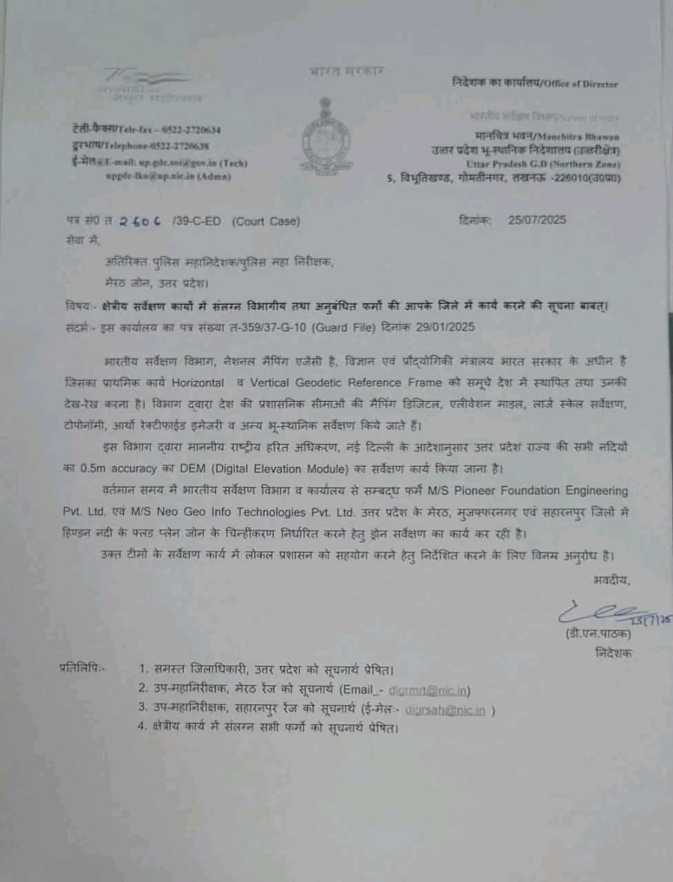 मेरठ के कई गांवों में ड्रोन दिखने का मामला, ड्रोन से किया जा रहा है नदियों का सर्वेक्षण, उत्तर प्रदेश भू स्थानिक निदेशालय के निदेशक ने अतिरिक्त पुलिस महानिदेशक और पुलिस महानिरीक्षक को लिखी चिट्ठी, मेरठ, सहारनपुर और मुजफ्फरनगर में चल रहा है।