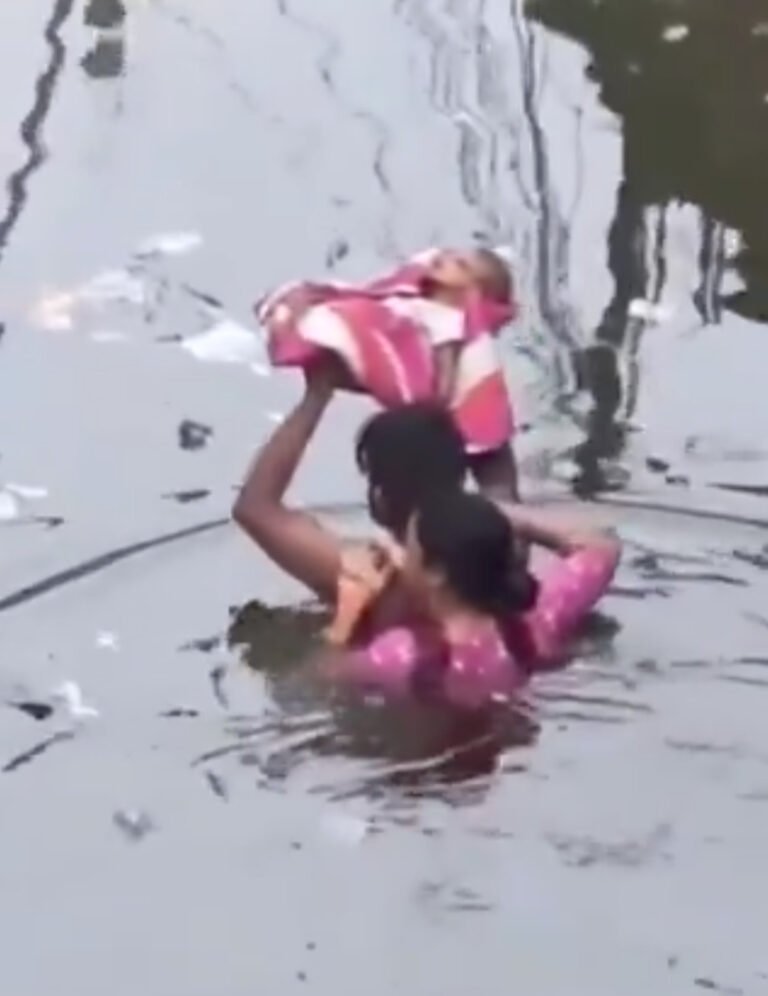यह प्रयागराज की गलियों में जन्मा एक आम शिशु है, जिसे उसके माता-पिता जलमग्न सड़कों से हाथों में उठाकर बचा रहे हैं।