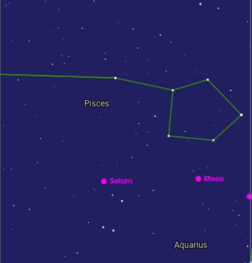 पिंड शनि की बात करें तो पाते हैं कि इसका राइट एसेन्शन: 00h 04m 30s एवं डिक्लिनेशन: 1°50′ दक्षिण तथा यह भी उस दौरान मीन (Pisces) तारामंडल में ही स्थिति होगा और इसकी चमक का मैग्नीट्यूड (Magnitude) 1.0 होगा एवं