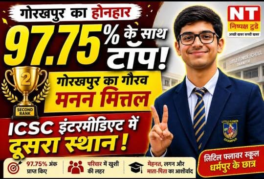 काउंसिल फॉर द इंडियन स्कूल सर्टिफिकेट एग्जामिनेशन (CISCE) द्वारा घोषित ICSC इंटरमीडिएट परीक्षा 2026 के परिणाम में गोरखपुर के होनहार छात्र मनन मित्तल ने 97.75 प्रतिशत अंक प्राप्त कर दूसरा स्थान हासिल किया है। इस शानदार उपलब्धि से पूरे शहर में गर्व और खुशी का माहौल है।