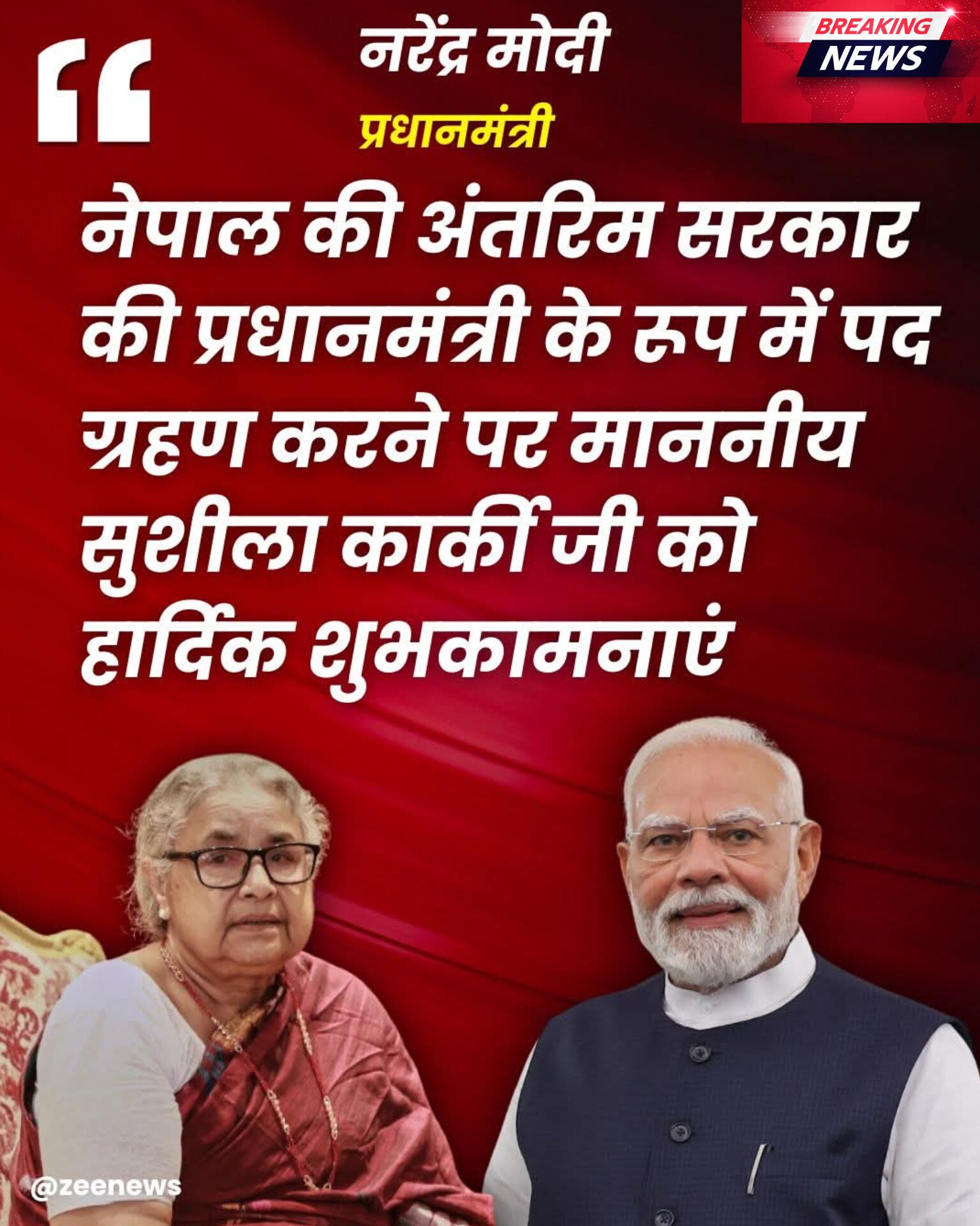 प्रधानमंत्री नरेंद्र मोदी ने नेपाल की अंतरिम प्रधानमंत्री सुशीला कार्की को बधाई दी है. नेपाल में Gen Z के उग्र और हिंसक विरोध-प्रदर्शन के बाद पड़ोसी देश में ओली सरकार के पांव उखड़ गए. प्रधानमंत्री केपी शर्मा ओली को अपनी कुर्सी छोड़नी पड़ी. इसके बाद नेपाल में ऐसे लीडर की तलाश शुरू हो गई जो न केवल युवाओं की पसंद हो, बल्कि टूरिज्म पर आधारित लैंडलॉक्ड देश को पटरी पर लाने में महत्वपूर्ण भूमिका निभा सके. 5000 से ज्यादा लोगों की बैठक में ज्यादातर सदस्यों ने सुशीला कार्की के नाम पर सहमति दर्ज कराई है. बतौर जज अपने कार्यकाल में सुशीला कार्की न सिर्फ भ्रष्टाचार बल्कि आतंकवाद के खिलाफ भी सख्त रुख अपना चुकी हैं. यही वजह है कि वो जेन-जी की पहली पसंद बनीं और 73 साल की उम्र में नेपाल की सियासत का प्रमुख चेहरा बन गईं.