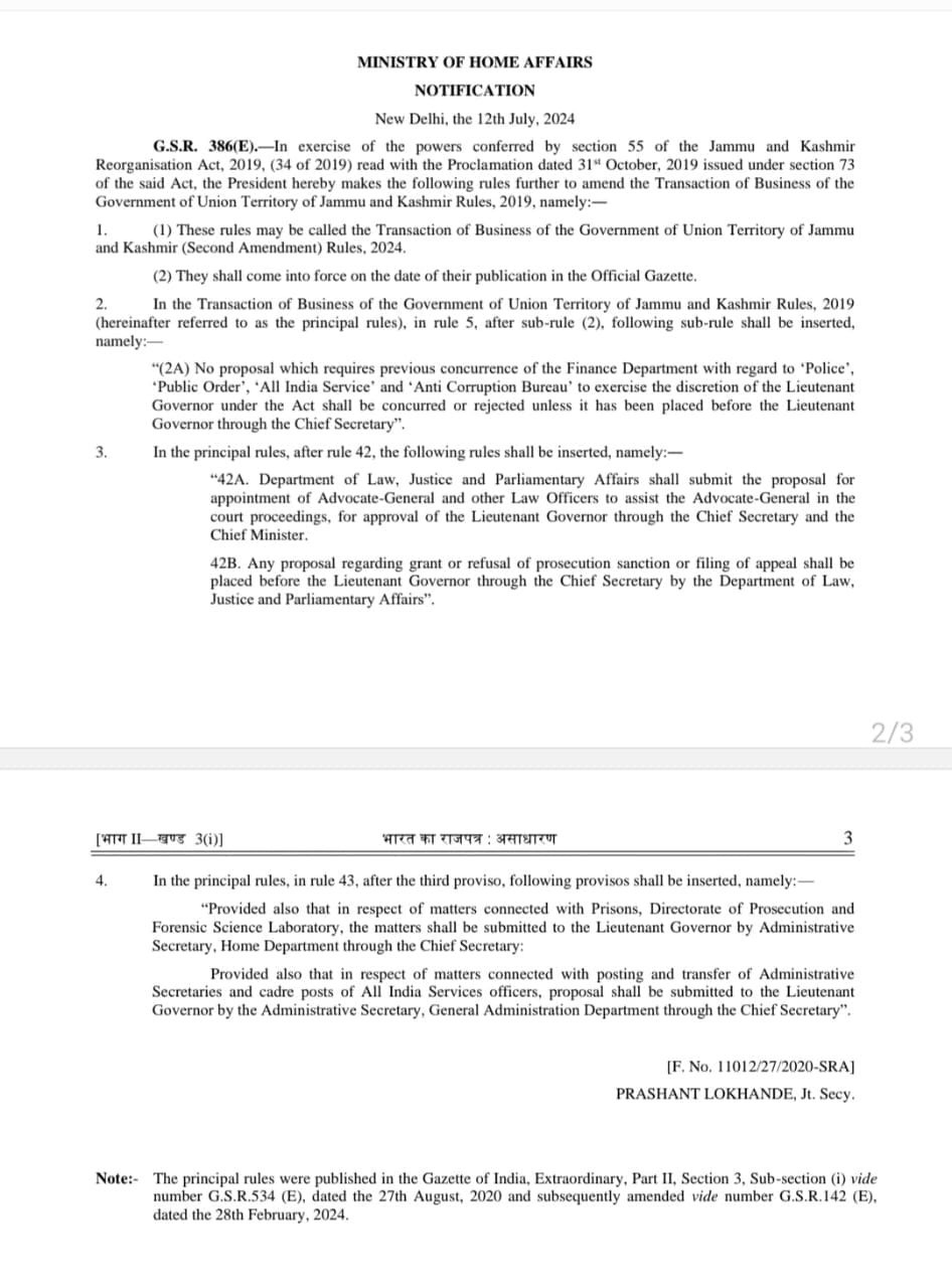 गृह मंत्रालय ने जम्मू और कश्मीर पुनर्गठन अधिनियम, 2019 की धारा 55 के तहत संशोधित नियमों को अधिसूचित किया है, जिसमें उपराज्यपाल को अधिक शक्ति देने वाली नई धाराएं शामिल की गई हैं।