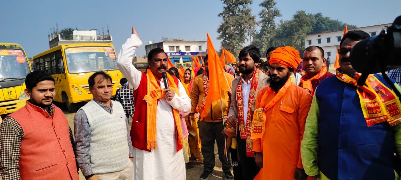 पूर्वांह सबसे पहले विधिविधान से वैदिक मंत्रोच्चार के बीच भाजपा के जिला कोषाध्यक्ष शत्रुघ्न कसौधन, नगर संघ चालक मनोज कुमार उमर व अशोक वर्मा के नेतृत्व में भूमि पूजन किया गया। इस दौरान पूरा मैदान जयकारे से गूंज उठा। उसके बाद बड़ी संख्या में पीत वस्त्र धारण कर पूजन स्थल पर पहुंची कन्याओं व महिलाओं ने कलश यात्रा निकाली। यात्रा चंद चौराहा, ब्रह्मस्थान, सिनेमा हॉल रोड, चौक से पक्का घाट पर पहुंचा। जहां सरयू का जल लेने के बाद पुनः वापस चौक से मछली हट्टा होते हुए पूजन स्थल पर पहुंचकर समाप्त हुआ। यात्रा में शामिल लोगों के जयकारों और घंटा घड़ियाल के से पूरे उपनगर का माहौल भक्तिमय हो गया। यात्रा में जेपी चंद, सूरज पांडेय, बजरंगी निगम, आकाश जायसवाल, संजय गुप्ता, छोटू वर्मा, उपेन्द्र जायसवाल, पंकज सोनकर, भानू प्रताप सिंह, संदीप, ओमप्रकाश वर्मा, वीरेन्द्र शर्मा, सूरज पाण्डेय, राजेश जायसवाल, दिनेश सिंह, गुड्डू राय, राजेन्द्र शुक्ला, दुर्गेश गुप्ता, कस्तूरी जायसवाल, देशानन्द, विक्की चौरसिया, सुरेन्द्र यादव, ध्रुव पाठक सहित बड़ी संख्या में महिलाएं पुरूष सम्मिलित रहे।