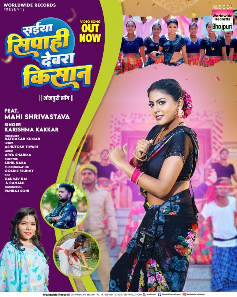वर्ल्डवाइड रिकॉर्ड्स प्रस्तुत लोकगीत ‘सइयां सिपाही देवरा किसान’ के निर्माता रत्नाकर कुमार हैं। इस गीत को सिंगर करिश्मा कक्कड़ ने खास अंदाज में गाया है। इसके वीडियो में एक्ट्रेस माही श्रीवास्तव ने अपनी अदाओं से गरदा उड़ाया है। इस गाने को गीतकार आशुतोष तिवारी ने लिखा है, जबकि संगीतकार आर्या शर्मा ने मधुर संगीत दिया है। वीडियो डायरेक्टर सुनील बाबा, कोरियोग्राफर गोल्डी एंड सनी, डीओपी गौरव राय एंड रंजन, एडिटर आलोक यादव हैं। डीआई रोहित सिंह, प्रोडक्शन पंकज सोनी ने किया है। इस गाने का ऑल राइट वर्ल्डवाइड रिकॉर्ड्स के पास है।