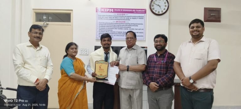 के.आई.पी.एम. कॉलेज ऑफ इंजीनियरिंग एंड टेक्नोलॉजी, गीडा के बी.टेक. इलेक्ट्रॉनिक्स एंड कम्युनिकेशन इंजीनियरिंग शाखा के चतुर्थ वर्ष के छात्र प्रणव खेतवानी का चयन रक्षा अनुसंधान एवं विकास संगठन (DRDO) के इंस्ट्रूमेंट्स रिसर्च एंड डेवलपमेंट एस्टेब्लिशमेंट लैब (IRDE), देहरादून में छह माह के पेड इंटर्नशिप प्रोग्राम के लिए हुआ है।