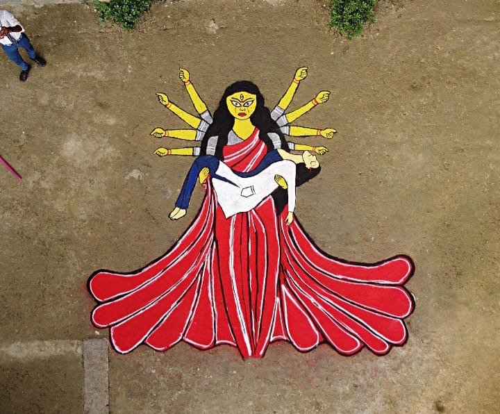 कोलकाता रेप/मर्डर थीम पर उकेरी मां दुर्गा की कलाकृति. बडहलगंज/ गोरखपुर (निष्पक्ष टुडे) कोलकाता में हुए मौमिता देवनाथ के साथ रेप मर्डर की थीम पर बड़हलगंज क्षेत्र के उमाशंकर विद्यापीठ कोड़ारी के छात्र अभिषेक त्रिपाठी द्वारा नवरात्रि पर मां दुर्गा का अनोखा चित्र बनाया जिसमें मां दुर्गा मौमीता के शव को गोद में लेकर भावुक मुद्रा में खड़ी हैं। इस कलाकृति को बनाने में 4 दिन का समय लगा।