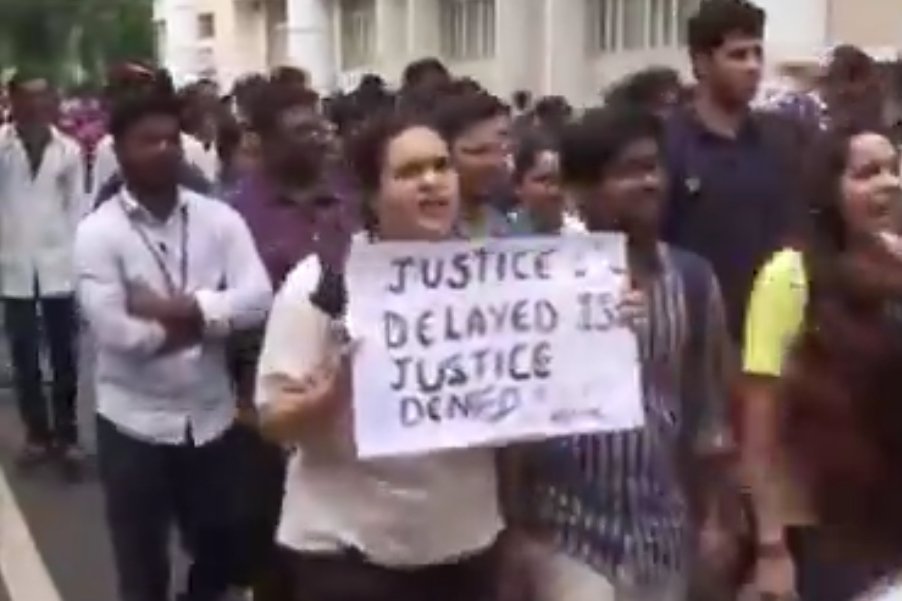 कोलकाता के आरजी कर मेडिकल कॉलेज एवं अस्पताल में पीजी ट्रेनी महिला डॉक्टर के साथ बलात्कार-हत्या मामले के खिलाफ AIIMS के डॉक्टरों ने विरोध प्रदर्शन किया।