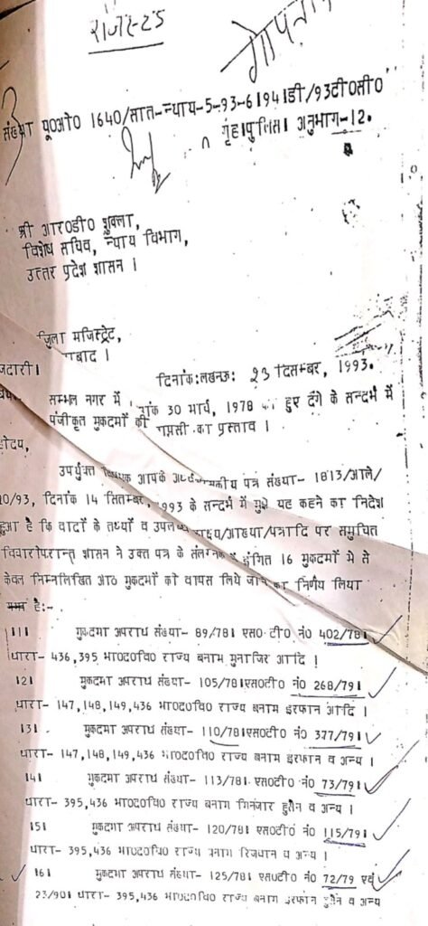 संभल :यूपी सरकार के न्याय विभाग की 1993 की एक चिट्ठी वायरल हो रही है, जिसमें दंगों के दौरान दर्ज केसों की जानकारी दी गई है।