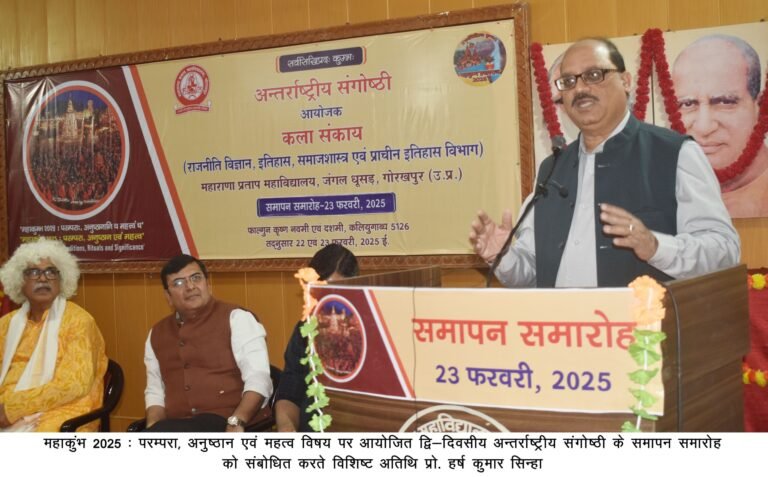 समारोह सत्र में सभी अभ्यागतों के प्रति आभार ज्ञापित करते हुए महाराणा प्रताप महाविद्यालय के प्राचार्य डॉ. प्रदीप कुमार राव ने कहा कि प्रयागराज महाकुंभ की दिव्यता और भव्यता से उत्तर प्रदेश का डंका पूरी दुनिया में बजा है। वैश्विक फलक पर उत्तर प्रदेश के हिस्से आई यह ख्याति मुख्यमंत्री योगी आदित्यनाथ के समर्पित प्रयासों का प्रतिफल है। ‘आस्था को सम्मान और विकास के नित नए प्रतिमान’ के सीएम योगी के विजन को देखकर विश्व समुदाय चकित है। उन्होंने महाकुंभ की सनातनी परंपरा और अनुशासन की महत्ता को वैश्विक पटल पर इस तरह प्रतिष्ठित किया है जिसे अनंतकाल तक याद किया जाएगा। अंतरराष्ट्रीय संगोष्ठी का प्रतिवेदन महाविद्यालय के सहायक आचार्य डॉ. सुबोध कुमार मिश्रा ने प्रस्तुत किया जबकि संचालन सहायक आचार्य रमाकांत दूबे ने किया।