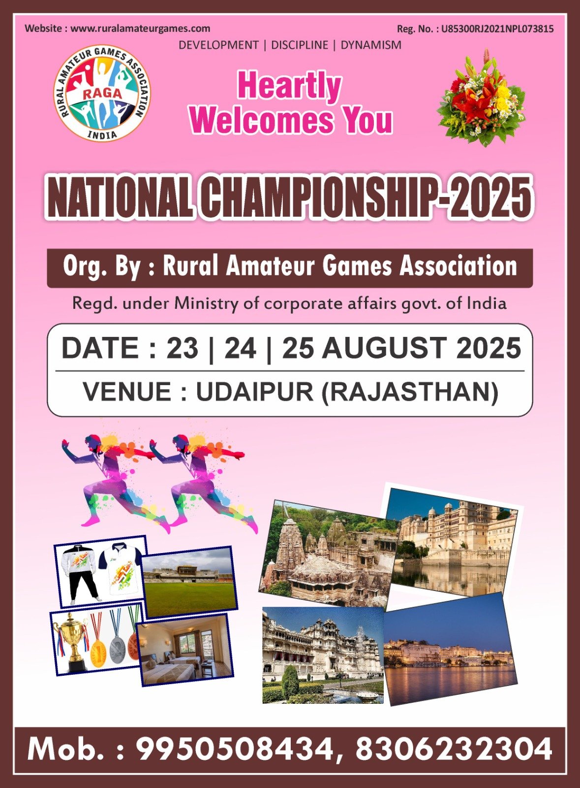 नमस्कार जी आपको सूचित किया जाता है। उदयपुर राजस्थान में नेशनल चैंपियनशिप 2025 होने जा रही है। दिनांक 23, 24, 25 अगस्त में हो रही है। रजिस्ट्रेशन लास्ट डेट से पहले आप रजिस्ट्रेशन करवाइए। ज्यादा से ज्यादा प्लेयर को पार्टिसिपेट करवाए, कॉल या मैसेज के जरिए हमें कंफर्म कीजिए।