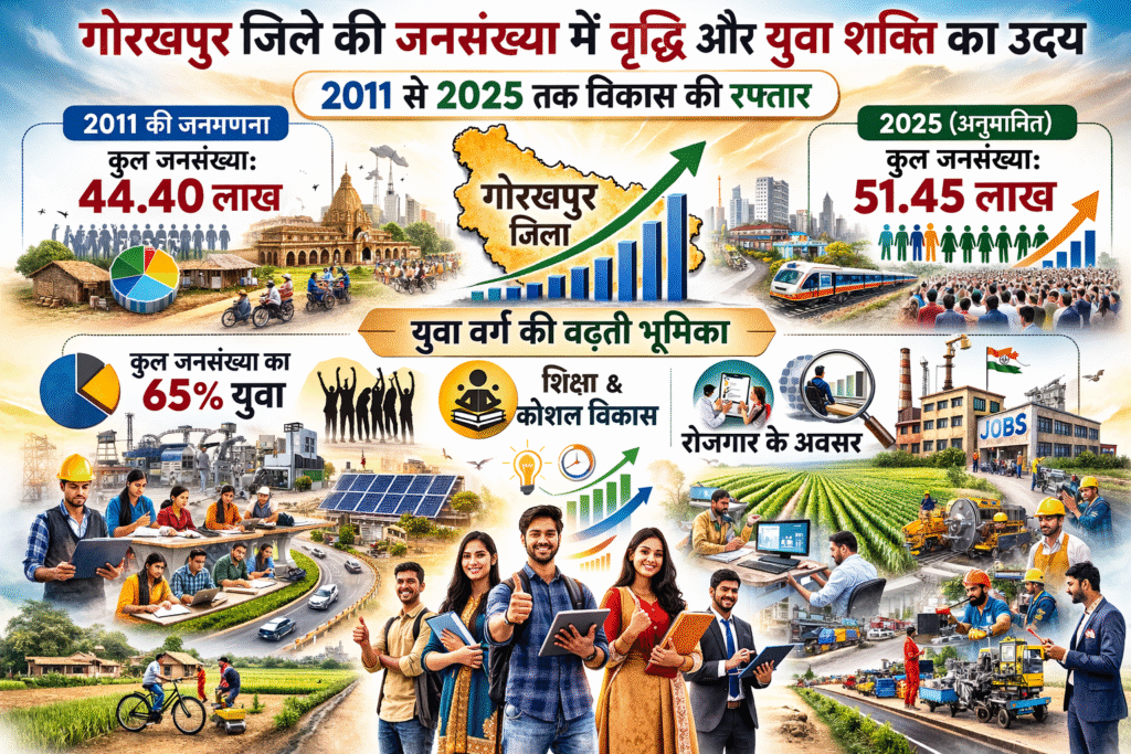 2011 की जनगणना के अनुसार गोरखपुर जिले की कुल जनसंख्या 44 लाख 40 हजार 895 थी, जिसमें युवा वर्ग का प्रमुख हिस्सा है, और 2025 तक अनुमानित जनसंख्या 51 लाख 45 हजार के करीब पहुँच चुकी है। इन आंकड़ों से स्पष्ट है कि युवाओं की बड़ी आबादी विकास की रफ्तार पकड़ रही है, लेकिन उन्हें अवसरों का लाभ उठाने के लिए कौशल और संसाधनों की आवश्यकता है।