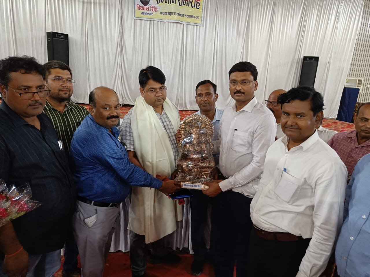 गोरखपुर। निवर्तमान सदर तहसीलदार विकास कुमार सिंह का गोरखपुर क्लब में ज्वाइंट मजिस्ट्रेट/ एसडीएम सदर मृणाली अविनाश जोशी के नेतृत्व में तहसील सदर परिवार के समस्त अधिकारियों कर्मचारियों व जिला प्रशासन के राजपत्रिक अधिकारियों ने गर्म जोशी से यादगार विदाई किया। सदर तहसील प्रशासन की तरफ से समस्त कानूनगो लेखपाल अमीन बीआरसी सहित अन्य कर्मचारियों को प्रशस्ति पत्र देकर सम्मानित किया गया। लेखपाल संघ अध्यक्ष राजू सिंह के नेतृत्व में 50 किलो के माला से निवर्तमान सदर तहसील विकास सिंह को माला पहनाकर यादगार विदाई दी गई उससे पूर्व जॉइंट मजिस्ट्रेट/ एसडीएम सदर मृणाली अविनाश जोशी ने निवर्तमान सदर तहसीलदार विकास कुमार सिंह को पुष्प गुच्छ देकर विदा की बारी-बारी से मुख्य राजस्व अधिकारी सुशील कुमार गौड़ एडीएम प्रशासन पुरुषोत्तम दास गुप्ता एडीएम वित्त विनीत कुमार सिंह नगर मजिस्ट्रेट मंगलेश दुबे एसडीम चौरी चौरा प्रशांत वर्मा उप जिला अधिकारी शिवम सिंह नायब तहसीलदार देवेंद्र यादव नायब तहसीलदार आकांक्षा पासवान वीआईपी बाबू आनंद मिश्रा ने निवर्तमान सदर तहसीलदार विकास कुमार सिंह को पुष्प गुच्छ देकर ससम्मान विदाई किए सदर तहसीलदार ध्रुवेंश कुमार सिंह ने अपने सहयोगियों राजस्व निरीक्षक विनय कुमार श्रीवास्तव प्रद्युम्न सिंह लेखपाल संघ अध्यक्ष राजूसिंह दिनेश पंकज रामकुमार गुप्ता सहित अन्य के साथ गणेश जी की प्रतिमा देकर विदा किए सदर तहसील के समस्त लेखपाल कानूनगो नेब निवर्तमान सदर तहसीलदार विकास कुमार सिंह को माला पहनाकर विदा किया। प्रदेश उपाध्यक्ष लेखपाल संघ धनंजय कुमार श्रीवास्तव ने अंग वस्त्र देकर अपने चहेते अधिकारी निवर्तमान सदर तहसीलदार को विदा किया। अंतरराष्ट्रीय गायक राकेश श्रीवास्तव द्वारा सांस्कृतिक कार्यक्रम प्रस्तुत किए गए। विकास कुमार सिंह 16 जुलाई 2021 को गोरखपुर में अपना पदभार कैंपियरगंज तहसीलदार के पद से शुरू किया था उसके बाद चौरी चौरा का तहसीलदार बनाया गया बाद में 11 अगस्त 2022 को जिलाधिकारी ने सदर तहसील का तहसीलदार बनाया था सदर तहसील में रहते हुए सरकार द्वारा चलाई जा रही महत्वाकांक्षी योजनाओं को अमली जामा बनाने में कोई कोर कसर नहीं छोड़ी थी अपने सहयोगी लेखपाल कानूनगो के मदद से जो सदैव याद किया जाएगा। 10 जुलाई को लखनऊ का तहसीलदार बनाया गया।