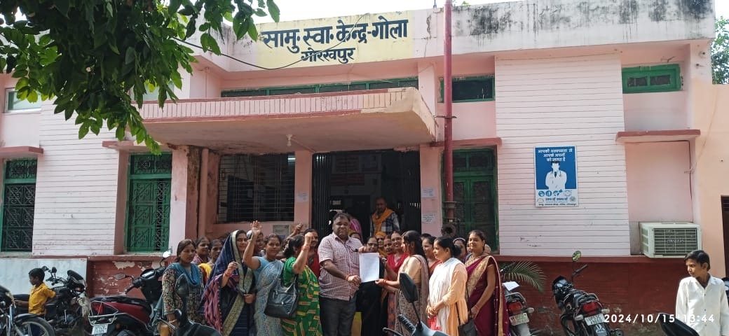 गोला। स्थित सीएचसी केंद्र पर एएनएम द्वारा धरना प्रदर्शन करने के पश्चात ऑनलाइन हाजिरी के विरोध में अधीक्षक डॉ अमरेन्द्र ठाकुर को मुख्य चिकित्साधिकारी को संबोधित ज्ञापन सौंपा गया.