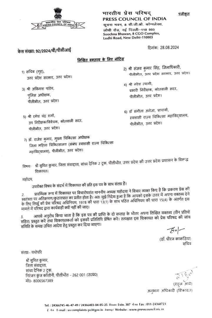 पीलीभीत के पत्रकार पर FIR से पीसीआई नाराज, डीएम-एसएसपी समेत 7 को भेजा नोटिस