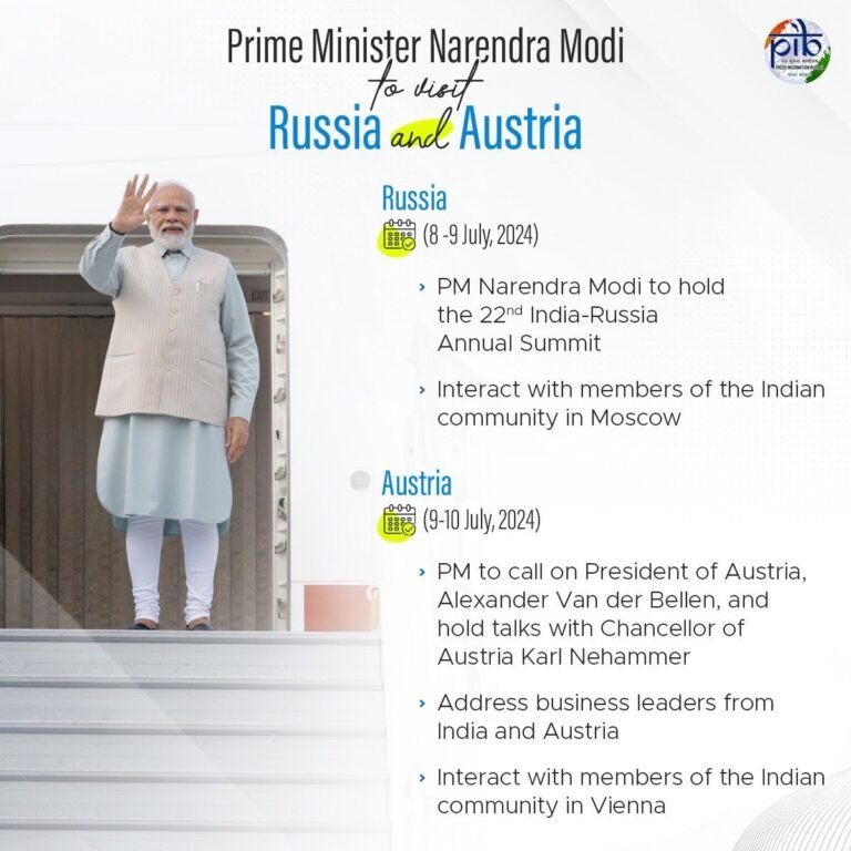 Share Facebook Twitter LinkedIn Pinterest Email प्रधानमंत्री @narendramodi आज रूस और ऑस्ट्रिया की तीन दिन की आधिकारिक यात्रा पर रवाना होंगे। #Russia #Austria Share this: Share on Facebook (Opens in new window) Facebook Share on X (Opens in new window) X Like this:Like Loading...