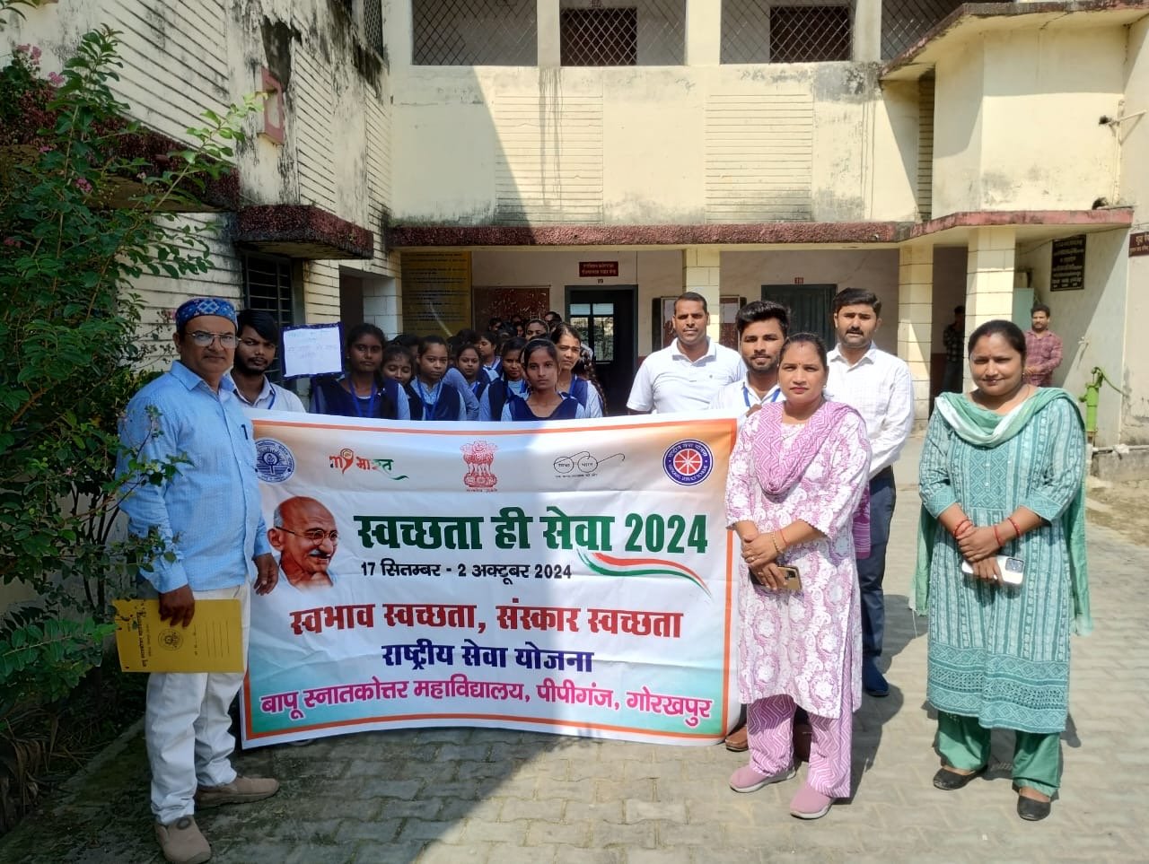 पीपीगंज।बापू स्नातकोत्तर महाविद्यालय में शुक्रवार को राष्ट्रीय सेवा योजना के तत्वाधान में स्वच्छता ही सेवा अभियान के अंतर्गत सर्वप्रथम स्वयंसेवक एवं सेविकाओं को स्वच्छता की शपथ कार्यक्रम अधिकारी डॉ देवनारायण पांडे द्वारा दिलाई गई।