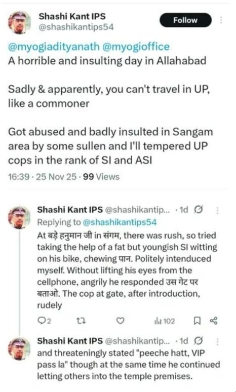आगे लिखा कि- संगम तट पर स्थित श्री बड़े हनुमान जी मंदिर पर भीड़ थी, इसलिए मैंने एक मोटे, लेकिन जवान दरोगा की मदद लेने की कोशिश की जो अपनी बाइक पर पान चबा रहा था। विनम्रता से अपना परिचय दिया। मोबाइल से नजरे हटाए बिना, उसने गुस्से से जवाब दिया, “उस गेट पर बताओ।” गेट पर मौजूद पुलिसवाले ने परिचय के बाद, बदतमीजी की।