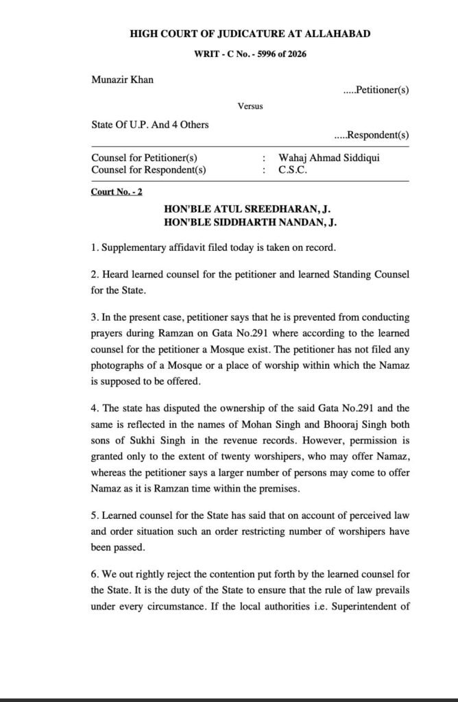 इलाहाबाद हाईकोर्ट ने संभल की एक मस्जिद में नमाज़ पढ़ने वालों की संख्या सीमित करने के उत्तर प्रदेश प्रशासन के आदेश को खारिज कर दिया है। अदालत ने इस मामले में प्रशासन को कड़ी टिप्पणी करते हुए कानून-व्यवस्था बनाए रखने की जिम्मेदारी याद दिलाई।