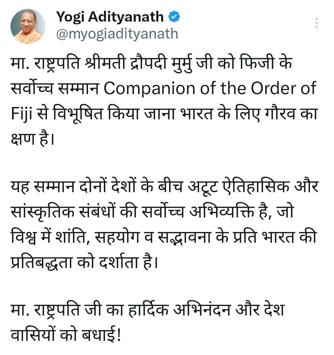 राष्ट्रपति द्रौपदी मुर्मू को फिजी का सबसे बड़ा सम्मान