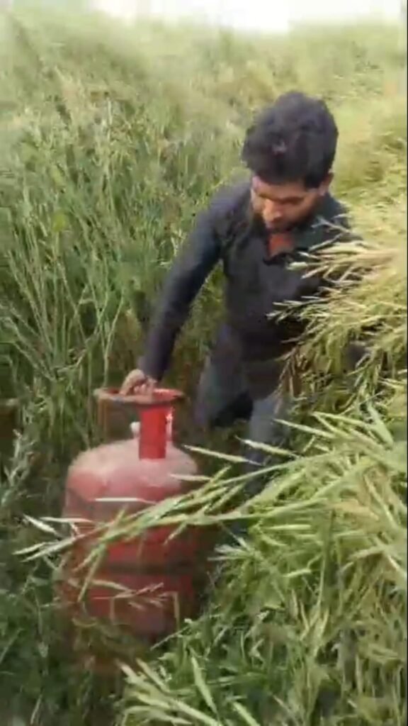 घेराबंदी के दौरान चोरी का सिलेंडर सरसों के खेत में छिपाया गया था।