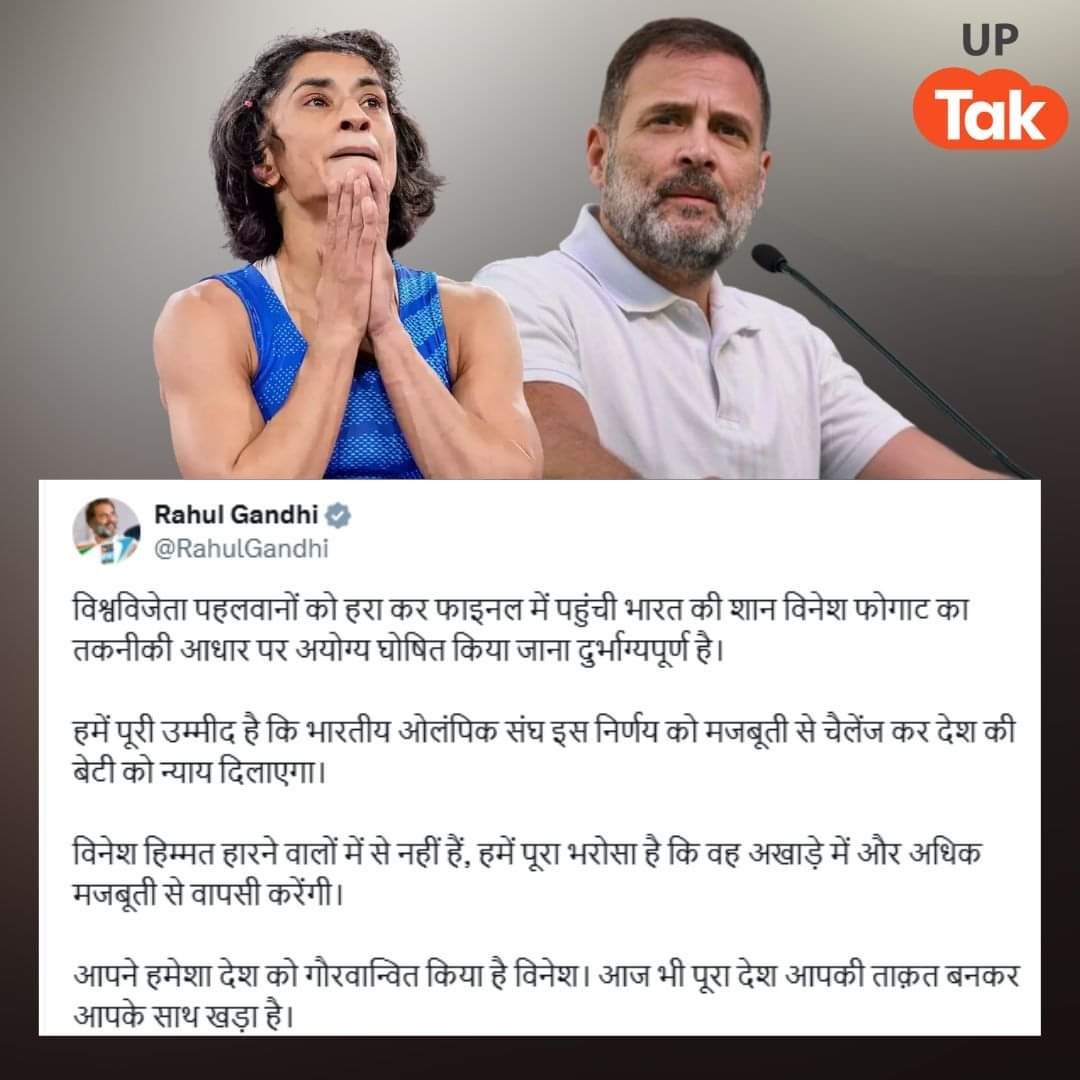 Rahul Gandhi ने विनेश फोगाट के तकनीकी आधार पर अयोग्य घोषित किए जाने को दुर्भाग्यपूर्ण बताते हुए X पर किया पोस्ट।