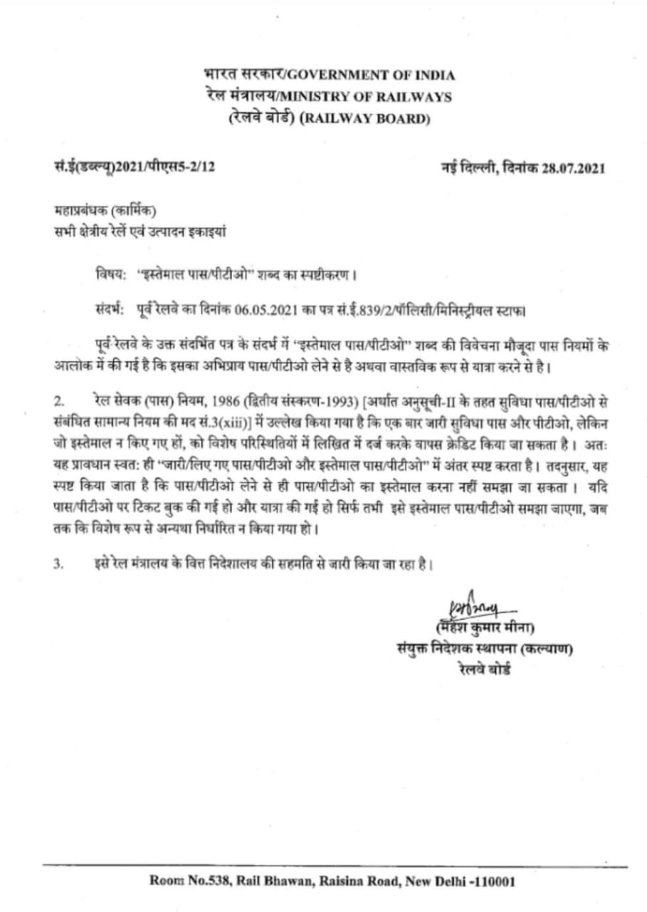 रेल कर्मचारियों को जारी पास/PTO के संबंध में