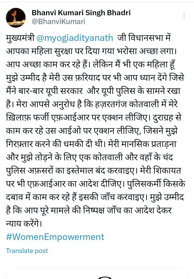 राजा भैया की पत्नी भानवी सिंह ने X पर मुख्यमंत्री से लगाई गुहार लिखा आपका महिला सुरक्षा पर दिया गया भरोसा अच्छा लगा