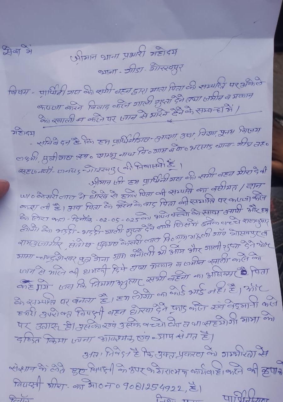 गीडा थाना क्षेत्र के भरसाड में एक सगी बहन ने पिता को गुमराह कर धोखे से सम्पत्ति का वसीयत कारा कर पूरी सम्पत्ति पर कब्जा कर रही है। पीड़ित बहनों ने गीडा थाने में शिकायत दर्ज कराकर कारवाई कराने की मांग किया है।