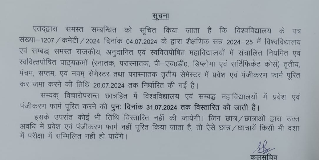 एतद्वारा समस्त सम्बन्धित को सूचित किया जाता है कि विश्वविद्यालय के पत्र संख्या-1207/ कमेटी / 2024 दिनांक 04.07.2024 के द्वारा शैक्षणिक सत्र 2024-25 में विश्वविद्यालय एवं सम्बद्ध समस्त राजकीय, अनुदानित एवं स्ववित्तपोषित महाविद्यालयों में संचालित नियमित एवं स्ववित्तपोषित पाठ्यक्रमों (स्नातक, परास्नातक, पी-एच०डी०, डिप्लोमा एवं सर्टिफिकेट कोर्स) तृतीय, पंचम, सप्तम, एवं नवम् सेमेस्टर तथा परास्नातक तृतीय सेमेस्टर में प्रवेश एवं पंजीकरण फार्म पूरित कर जमा करने की तिथि 20.07.2024 तक निर्धारित की गई है। सम्यक् विचारोपरान्त छात्रहित में विश्वविद्यालय एवं सम्बद्ध महाविद्यालयों में प्रवेश एवं पंजीकरण फार्म पूरित करने की पुनः दिनांक 31.07.2024 तक विस्तारित की जाती है।