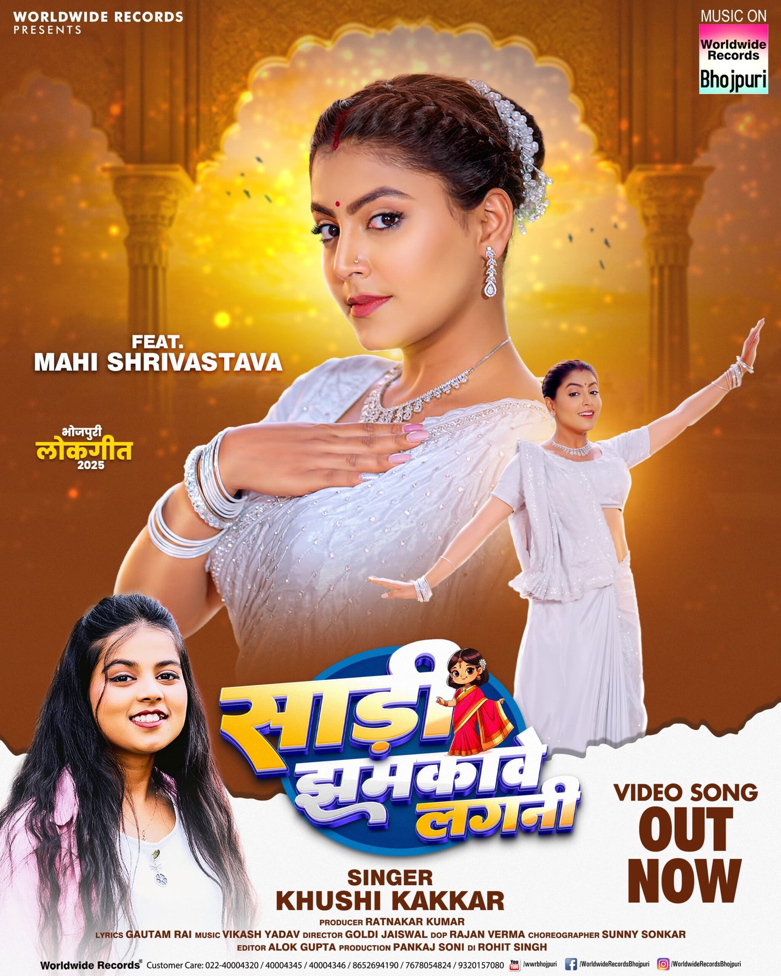 वर्ल्डवाइड रिकॉर्ड्स प्रस्तुत नया भोजपुरी लोकगीत ‘साड़ी झमकावे लगनी’ के निर्माता रत्नाकर कुमार हैं। इस गाने की सिंगर खुशी कक्कड़ हैं। इस गाने में एक्ट्रेस माही श्रीवास्तव ने शानदार अदायगी किया है। इस गीत को गीतकार गौतम राय (काला नाग) ने लिखा है, जबकि संगीतकार विकास यादव ने मधुर संगीत दिया है। वीडियो डायरेक्टर गोल्डी जायसवाल, डीओपी राजन वर्मा, कोरियोग्राफर सनी सोनकर, एडिटर आलोक गुप्ता हैं। डीआई रोहित सिंह ने किया है। इस गाने का ऑल राइट वर्ल्डवाइड रिकॉर्ड्स के पास है।