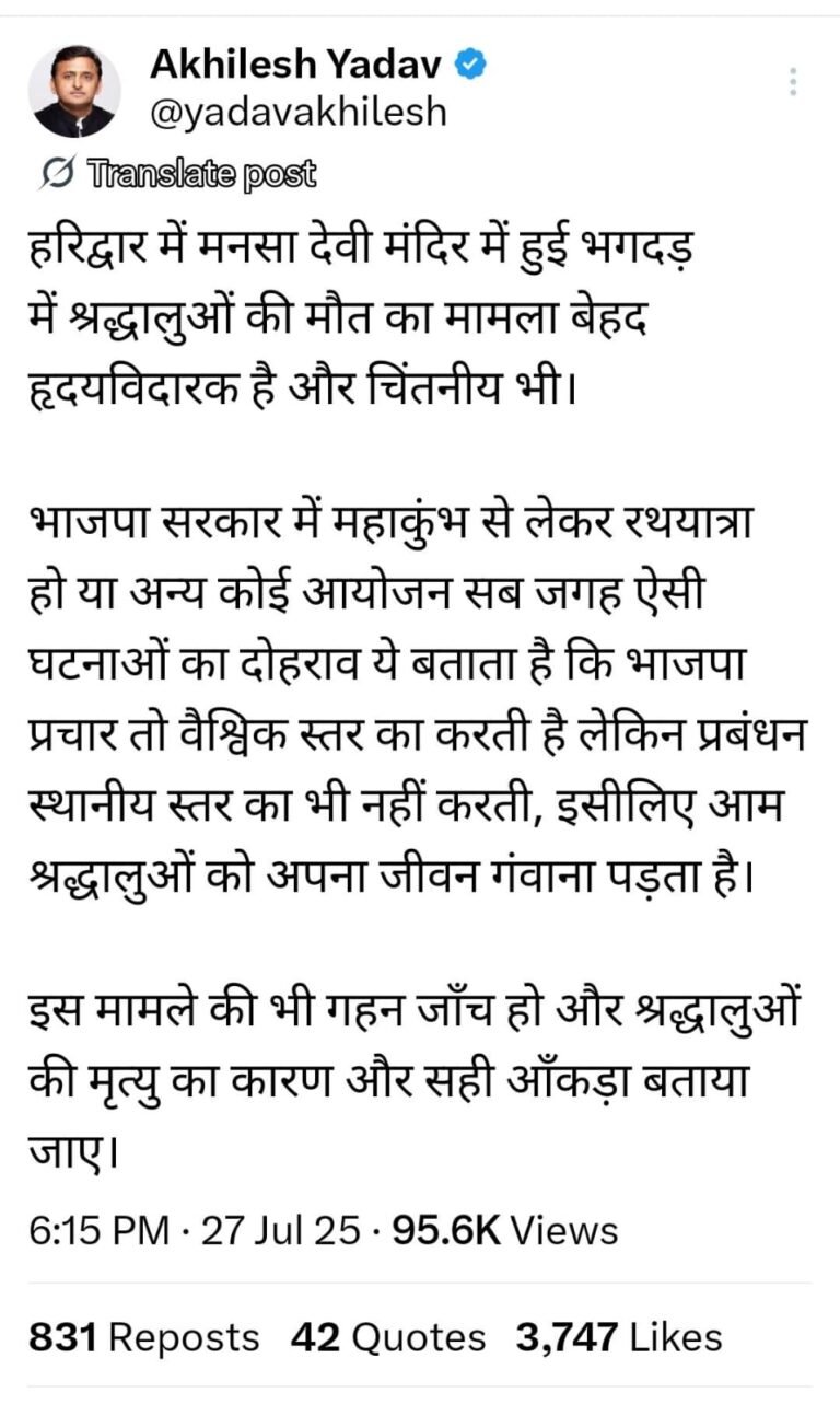 उतर प्रदेश के पूर्व मुख्यमंत्री अखिलेश यादव का ट्वीट हरिद्वार में मनसा देवी मंदिर में हुई भगदड़ में श्रद्धालुओं की मौत का मामला बेहद हृदयविदारक है और चिंतनीय भी।