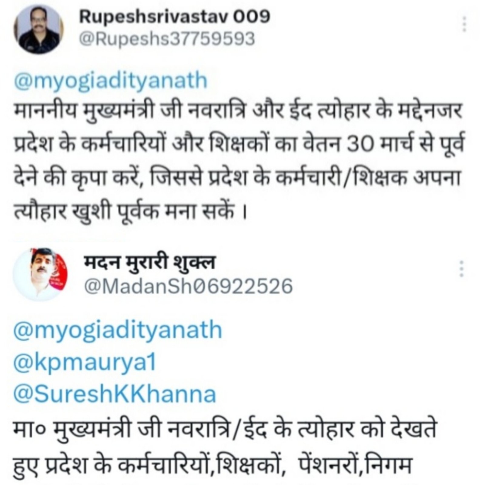 नेतागण ने कहा कि मार्च के महीने में ही होली का त्यौहार होने के कारण कर्मचारियों का बजट बिगड़ गया है इस महीने में किसानों को खेती की कटाई मड़ाई आदि का भी कार्य करना है और महीने के अंतिम दिनों में नवरात्रि और ईद का त्यौहार है इसलिए हम माननीय मुख्यमंत्री जी से यह गुहार लगाते हैं कि वह 30 तारीख तक हर हाल में वेतन और पेंशन दिलाने की कृपा करें।
