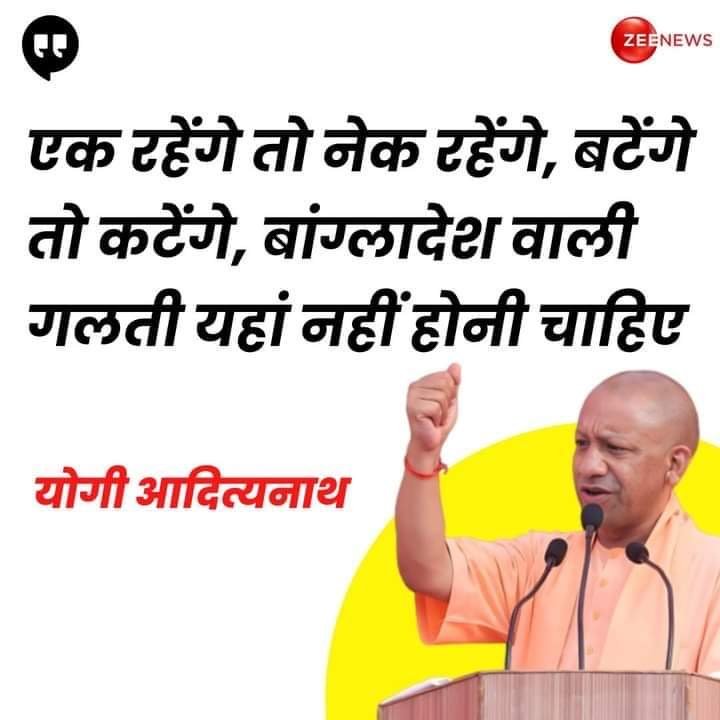 उत्तर प्रदेश के मुख्यमंत्री योगी आदित्यनाथ ने आगरा में एक सभा को संबोधित करते हुए कहा कि, “राष्ट्र से ऊपर कुछ भी नहीं हो सकता. और राष्ट्र तभी सशक्त होगा जब हम एकजुट होंगे. ‘बटेंगे तो काटेंगे’… सीएम योगी ने आगे कहा कि आप देख रहे हैं कि बांग्लादेश में क्या हो रहा है. वो गलतियां यहां नहीं दोहराई जानी चाहिए… ‘बटेंगे तो काटेंगे, एक रहेंगे तो नेक रहेंगे’…” हमें विकसित भारत की संकल्पना को साकार करने का कार्यक्रम करना है.”