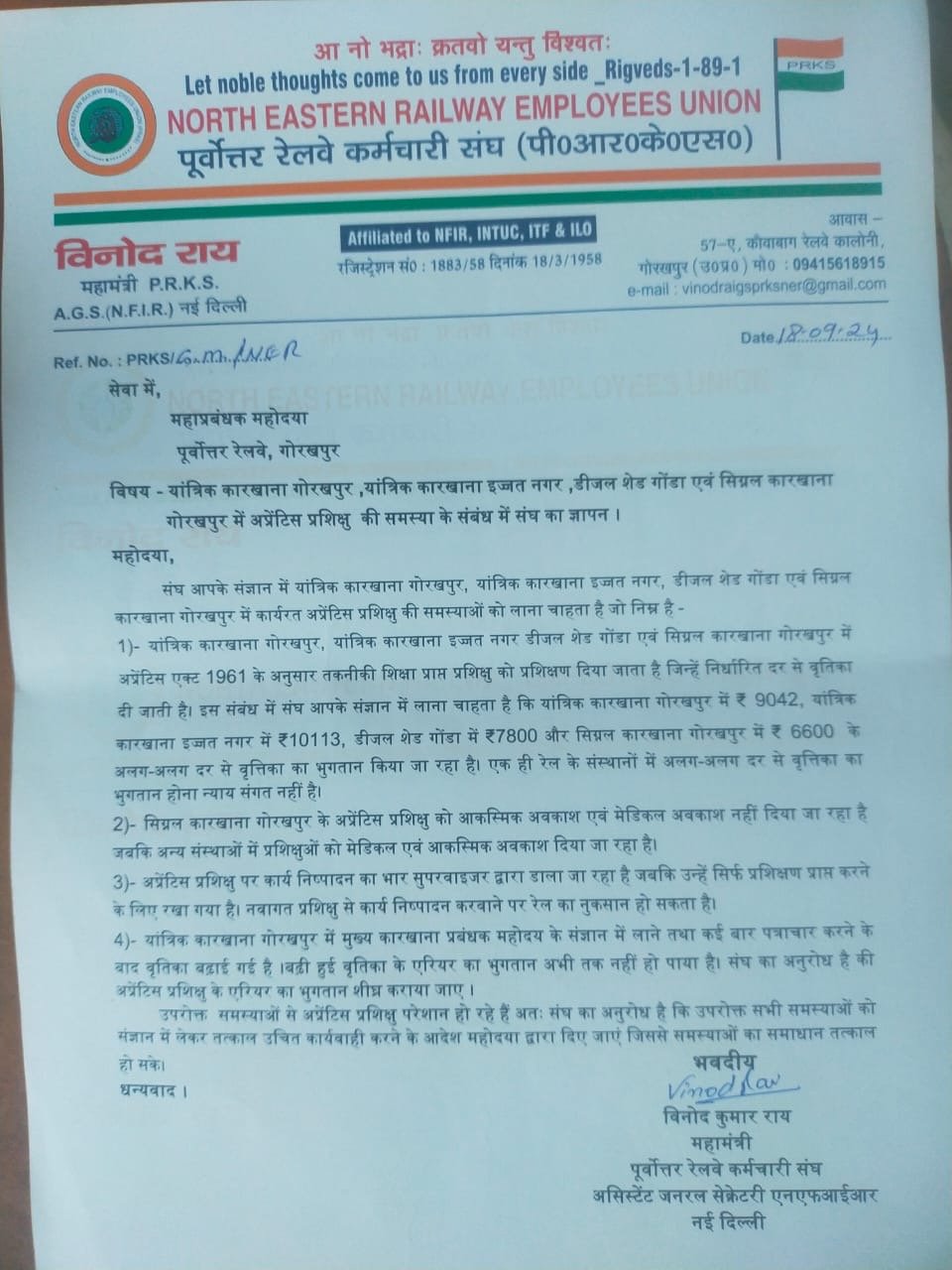 विषय- यांत्रिक कारखाना गोरखपुर ,यांत्रिक कारखाना इज्जत नगर ,डीजल शेड गोंडा एवं सिग्नल कारखाना गोरखपुर में अप्रेंटिस प्रशिक्षु की समस्या के संबंध में संघ का ज्ञापन।
