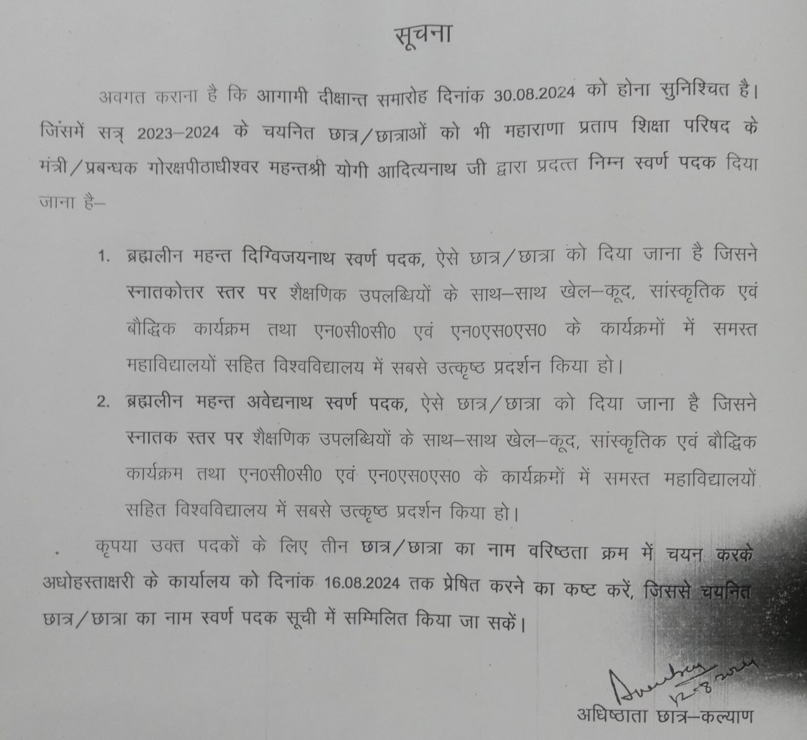 अवगत कराना है कि आगामी दीक्षान्त समारोह दिनांक 30.08.2024 को होना सुनिश्चित है। जिसमें सत्र 2023-2024 के चयनित छात्र/छात्राओं को भी महाराणा प्रताप शिक्षा परिषद के मंत्री / प्रबन्धक गोरक्षपीठाधीश्वर योगी आदित्यनाथ द्वारा प्रदत्त निम्न स्वर्ण पदक दिया जाना है-