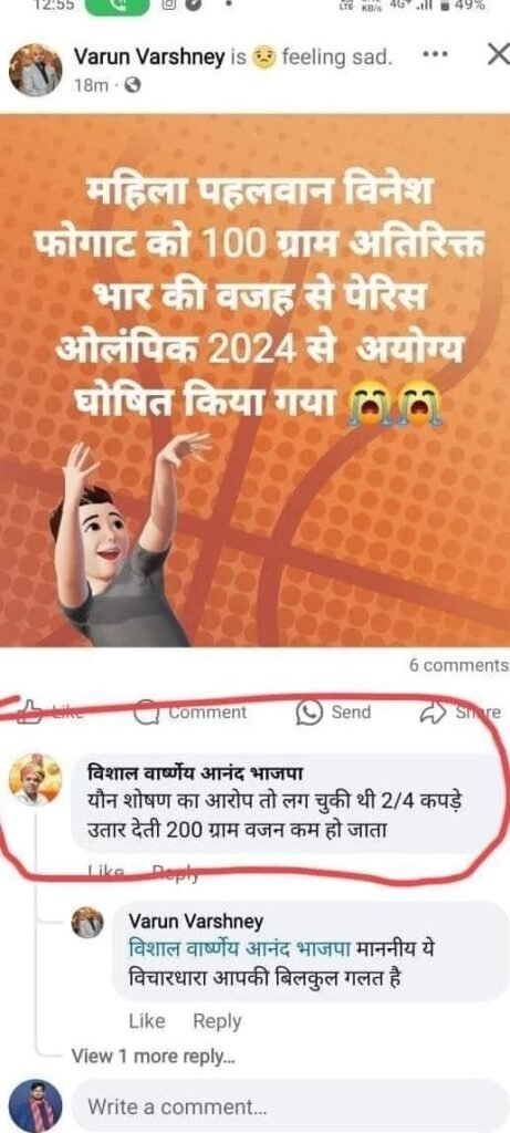 देश की शान विनेश फोगाट के लिए फेसबुक पर ऐसा लिखने वाले अलीगढ़ के BJP कार्यकर्ता विशाल वार्ष्णेय पर FIR दर्ज हुई।